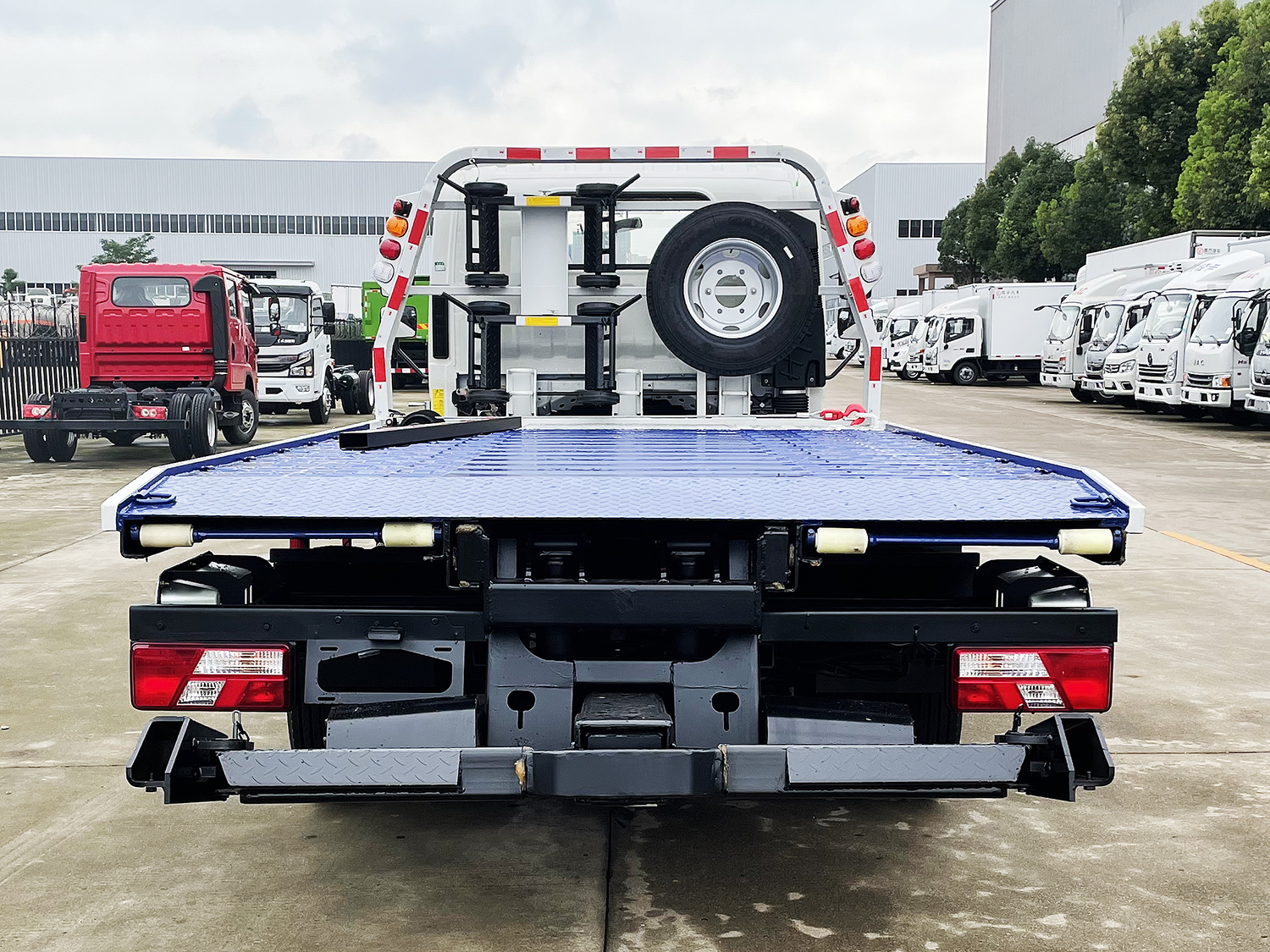 藍(lán)牌上裝配置:沖壓式伸縮板,液壓翻轉(zhuǎn)常規(guī)托舉裝置,平板可承載4噸以內(nèi)重物,主板長(zhǎng)4~4.2米,折疊、伸縮或翻轉(zhuǎn)部分1~1.35米,平板總長(zhǎng)可達(dá)5.1~5.35米,雙側(cè)聯(lián)動(dòng)操作裝置,后工作燈三只,1個(gè)40KN液壓絞盤(25米鋼絲繩)一個(gè)工具箱一個(gè)洗手箱,配兩個(gè)**小車,四根新式綁帶,鏈鉤1條,L型抱胎架一對(duì),托叉和托叉座各一對(duì),帶2噸后托臂。