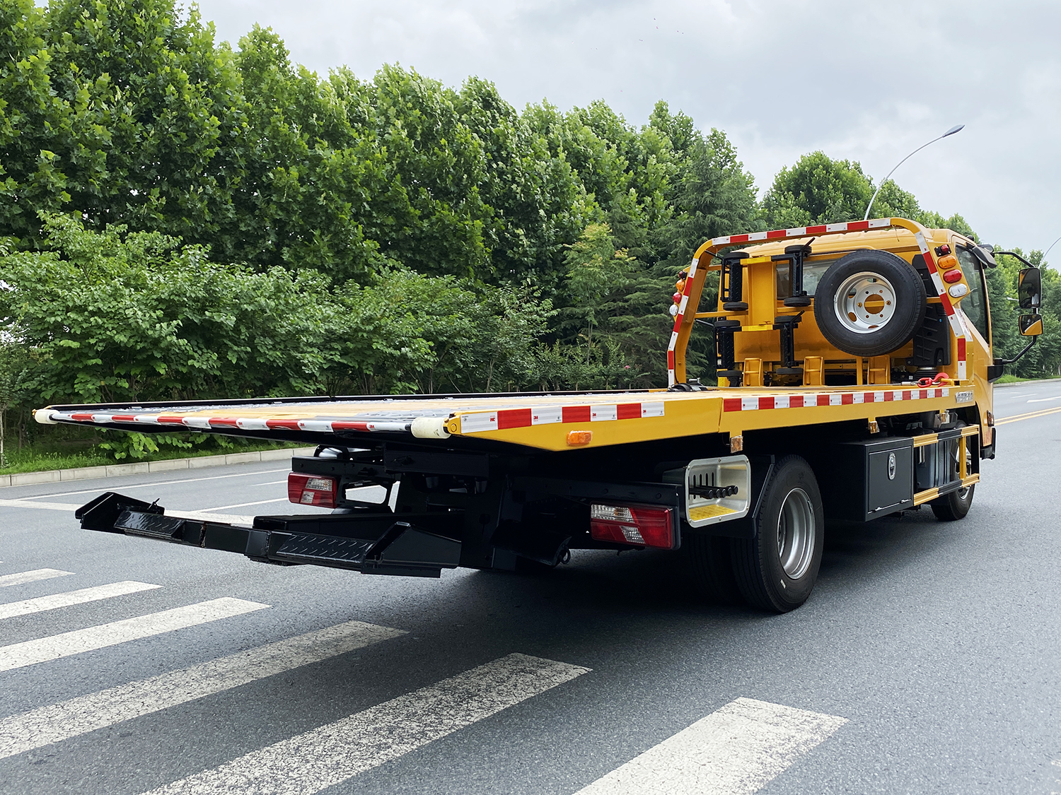 上裝配置:藍牌沖壓平板一體板,板長5350,帶一個活動尾板;雙側(cè)聯(lián)動操作裝置,后工作燈三只,1個40KN絞盤(配25米鋼絲繩),1個工具箱,配2個小車,1對L型抱胎架,4根插綁帶,1對托叉及托叉座,1條鏈鉤,配2噸后托臂。